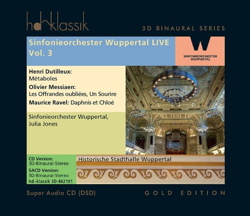 HD-Klassik is a branch of the Cybele label, which already has a well established reputation for fine recorded sound. This series uses binaural sound which, as the opening calibration track tells us, is intended for headphone use. This is the third in an edition recording a variety of repertoire live in concert with the Wuppertal Symphony Orchestra, volume 1 of which recorded Dohnányi and Brahms (review), and volume 2 of which took in Wagner and Berlioz (review). This orchestra has also recorded Dukas and Holst (review) for HD-Klassik, and the fruitful collaboration seems set to continue.