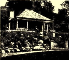 Old Cumbria Gazetteer notes: “The gardens were consciously designed as an arboricultural museum by Thomas H Mawson, Robert Mawson and Dan Gibson, and were sheltered by conifers; Mr Martin was a noted plant collector.” The summer house, pictured above, was illustrated by Mawson (1912, p. 151).