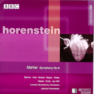 A history lesson first. In early 1958 the BBC, in the shape of Robert Simpson then a senior BBC executive, decided they would mark the centenary of Gustav Mahler's birth by mounting a cycle of his symphonies in 1960. Bernard Keeffe, also working at the BBC, was asked by Simpson to be in charge of some of the broadcasts. Then, in late 1958, the BBC's Third Programme (forerunner of Radio 3) found itself under budget for the year ending March 1959 and knew if the excess wasn't spent it would find its budget for the following year cut. Consequently Simpson and Keeffe were asked to come up with a project for the first half of 1959 to mop up the cash. They decided a broadcast of the most expensive concert item in the repertory; Mahler's Eighth would fit the bill and act as curtain raiser to their Mahler cycle the following year. Keeffe had just five months to put the enterprise together and knew he was a man with problems. Firstly, hardly anyone in London knew the work. The last performance had been in 1948 under Boult and that had only been the third ever in Britain. He also had to find a hall, choirs, soloists and orchestra. Most crucially he had to find a conductor who could not only conduct the work but also teach the Mahler style to performers who, in 1959, were largely unfamiliar with it. One name stood out - Jascha Horenstein. Keeffe knew Horenstein's work, and crucially his Mahler, from pioneering Vox recordings and was delighted when he secured his services at such short notice. He must, however, have been aware that not even Horenstein had conducted the work before. This is the background to the remarkable concert performance of March 20th 1959 preserved on these CDs. By then the London Symphony Orchestra had been engaged, the best choirs in London (which Bernard Keeffe would train), the composer/conductor Berthold Goldschmidt as Horenstein's "first lieutenant" and a team of superb soloists. In the latter case Keeffe engaged a full team of stand-ins. There were two reasons for this. With the parts so unfamiliar, Keeffe knew if any of the soloists became ill it would be impossible to engage replacements. It also mopped up more money, as also had the involvement of the BBC engineers who decided to attempt their first stereo concert relay. The Royal Albert Hall had been hired as the only venue in London worthy of the event but only a Friday was available. This meant the largely amateur choirs would not be able to take part in a full rehearsal there in the morning of the concert so that took place with everyone crammed into the concert hall of the Royal College of Music the previous night. The actual performance was therefore the first time the whole ensemble of 756 musicians and singers (including, in the enhanced 130-piece LSO, Hugh Maguire as Concert Master, Neville Marriner leading the second violins, James Galway on the piccolo, Barry Tuckwell leading the horns and Gervase de Peyer the clarinets) actually performed any of the work in the Royal Albert Hall all together. Bernard Keeffe went to wish Horenstein luck before he took to the platform on the night. He looked nervous. "I face the greatest artistic challenge of my career," he told Keeffe. The concert itself and its live broadcast went into legend. It is said, with justification, that this was the event that began the Mahler boom in Britain, reinforced by the full cycle in London the following year (conducted by Horenstein, Barbirolli, Steinberg, Susskind and Boult). The reaction of the six-and-a-half thousand strong full house at the close of the work, vividly captured on these discs, is contemporary evidence enough. The BBC recorded the concert and transcription discs went out to radio stations around the world. Unfortunately there was a glitch and the quality of the discs was impaired which did little to endear the recording to station managers. Then, for many years, it was never heard of again to the extent that many came to believe the BBC had either lost the master tape, destroyed it, or never even possessed it in the first place. Around 1970 I remember being told quite seriously that they had not bothered to record it at all. In the 1980s bootleg versions from the transcription discs started to appear on LP and then a CD version taken from those LPs. The quality of all these illegal issues was very poor but it confirmed what all the old British Mahler hands had said - here was a very great performance. It also added impetus for an official release, if only the BBC still had their original tape and would do the decent thing. At last, some pestering brought a letter in Gramophone magazine from the BBC. Not only did they still have the original tape well preserved they had also made a digital copy and were considering an issue. There were a couple of false starts but this was militated a little by a broadcast of that digital tape in February of 1997 where, at last, the quality of what the archives still held was plain to hear for anyone with two ears and a stereo tuner (and recording equipment!) Now, the BBC have at last issued a 20-bit remastered version as part of their new series of CD issues on their own label, BBC Legends, which represents, to quote the publicity material, "the official unlocking of the BBC archives" over the next three years. The first ten releases are available in the UK now and will go on worldwide sale early in the New Year. Let's deal with the sound first. Having heard various airchecks and pirates of this down the years I thought the broadcast of February 1997 was as good as it would get, (taking into account the "limiting" used in FM broadcasts) but there is no doubt the remastering engineers have gone two, even three, stages further to produce a sound needing few apologies except to the most determined hi-fi fanatic. The remastering has been done by the same engineer who did the Millennium releases of the old Westminster catalogue, Marcus Herzog at Syrinx of Hamburg. Not surprising since the sa