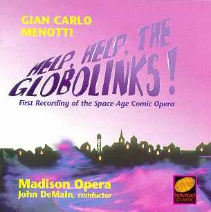 "Attention, attention! Unknown flying objects from another planet and creatures identified so far only as Globolinks, have landed on Earth. All citizens are asked to remain calm. Be on your guard. Stay tuned for further broadcasts. THE GLOBOLINKS ARE HERE!" A scene from some science fiction movie? It certainly could have been; the admonition is so familiar but, no, this is the opening spoken narrative that follows some evocative night skies, space-sweeping and reminiscent-of- schooldays orchestral music in Menotti's space-age opera for children of all ages, Help, Help, The Globolinks. Composed in 1968 and first performed in Hamburg. This is it's first recording. Menotti's music for ...Globolinks is appealing and accessible and often very amusing. The opera has a message that should be heeded in every school. Amusing electronics characterise the globolinks. The opening scene has them gathering around a school bus. They are about to converge on the children when they are repulsed by the sound of the horn. The children awaken and are alarmed but Tony, the bus driver, tries to comfort them. Then they learn from the bus radio that the globolinks are at large and that they are frightened of the sound of musical instruments. However, all the children, who are returning to school after their holidays, had left their instruments at school except for Emily who is persuaded to go to the school for help from the teachers, playing her violin as she goes to protect her against the globolinks. Tony, sung commandingly and heroically by tenor David Small, has a memorable aria as he persuades Emily to go and find help, "Let music clear your path..." His aria is broadened out to include the children's voices and he sings in counterpoint to them as they urge Emily to "Make arrows of your scales; pierce the night with your bow..." Emily (beautifully sung by Erin Windle) replies with an equally enchanting aria, "Farewell, my friends... After brave Emily departs, we hear a lovely interlude with a prominant part for the violin. This interlude, and its preceeding conclusion to Scene I, is the high point of the opera. Scene II opens with the globolinks' electronic music but we are now at the school where the Dean is worried about the whereabouts of the children. Where is the school bus? Timothy, his dim-witted school custodian is no help. Then the Dean's concern is inflamed by the entrance of the school's music teacher Mme Euterpova who is threatening to resign because the children are not receiving any encouragement from the Dean to study music and she deplores the face that they had all gone on holiday without taking their instruments to practise on. "You do not know the power of music", she amonishes him. "That's what is wrong with the world! It has forgotten how to sing!" But the Dean remains unconcerned and Mme Euterpova (sung with real shrewish relish by Rachel Joselson) sweeps out but not before she lets us know that she is in love with him. From the radio we hear that musical instruments are the only defence against the globolinks who can penetrate walls and doors but the Dean thinks it is all nonsense and now exhausted, he dozes off. A globolink enters and touches him. At once he begins to change into a globolink himself for he looses his voice and only electronic sounds come from his mouth much to the concern of Timothy who calls on the teachers to help him. They recognise the problem and resolve to collect up the instruments and go off to rescue the children. Timothy finds a tuba and discovers that it's tune can kill globolinks. Mme Euterpova takes charge of the situation and after reversing the "spell" on the Dean in getting him to sing one note - "La", the teachers go off on their quest stirringly singing "Musicians unite, let the trumpet blaze..." After another interlude contrasting the eerie danger of the globolinks with the heroic theme of the rescuers, with important parts for piccolo and tuba, we are back with the children now cowering in the shadow of their bus because the globolinks are becoming more and more daring and they will soon overcome the children. Tony, the bus driver, encourages the children to sing the school song to keep up their spirits but the globolinks seem to be just enraged by it (a nice ironic touch which will appeal to many school children) Just as all seems lost, the teachers appear and the globolinks retreat. After rejoicings, a roll call of the children reveals Emily still missing. Everyone goes off armed with their instruments in search of her, led by the Dean who can now fly. An amusing orchestral march accompanies them . Scene four is set in the forest. Emily is lost; she is surrounded by globolinks. Menotti here gives us a haunting violin melody and Emily sings plaintively "I still cannot find the way...but I must play on." She has to rest and falls asleep. A globolink picks up her violin but its sound frightens him away. Alas he drops it in his hasty retreat and it is broken. Emily is distraut because she now has no protection. But then Dr Stone, the Dean, appears. She cannot understand why he keeps on singing La, then she is frightened when he turns completely into a globolink and flies away. At this point the rescue party arrives to save Emily. Mme Euterpova is philosophical about the loss of her Dean but decides she should now look for another husband. She then says that a lesson should be learnt from the day's events. And to another splendidly affecting Menotti theme (rather Elgarian nobilmente) she sings, "Unless we keep music in our soul, a hand of steel will clasp our hearts and we shall live by clocks and dials instead of air and sun and sea. Make music with your hands, make music with your breath." In a miscalculation - an understandable miscalculation - yet a sad error of taste, this laudable sentiment is brushed aside by another teacher's admonition that the message is boring. The opera then draws to a close as the cast departs but isn't that a wee globo