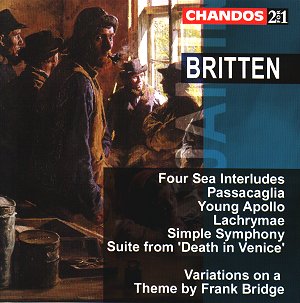 BENJAMIN BRITTEN (1913-76) Four Sea Interludes and Passacaglia from Peter Grimes (1945) [22:58] *  Young Apollo (1939) [8:02] ** Suite from Death in Venice (arr Steuart Bedford) (1976) [26:53] ***  Variations on a Theme of Frank Bridge (1937) [29:32] **  Lachrymae - Reflections on a song of John Dowland (1950, 1976) [16:12] **  Simple Symphony (1934) [18:23 ]** * Ulster Orchestra/Vernon Handley ** I Musici de Montréal/Yuli Turovsky *** English Chamber Orchestra/Steuart Bedford Rivka Golani (viola) in Lachrymae Recorded Ulster Hall, Belfast, 26 March 1986 (Grimes); Tooting 27 Nov 1984 (Death in Venice); Paroisse La Nativité, Montréal, 3-4 June 1989 (remainder) CHANDOS 2for1  CHAN 241-2 [122:20]