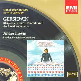 Previn, with his versatile background of jazz, show business and film music, as well as conventional concert music, was the ideal interpreter of Gershwin bringing a freshness, spontaneity and above all a sparkling joie de vivre to these interpretations. Just listen to the opening of the Rhapsody in Blue, for instance: the sheer joy of the clarinet's wail complete with the cheeky little twist in its tail, is counterbalanced by emphatic timpani and a really saucy answering call from the trumpet played "in the hat". Previn convinces the London Symphony Orchestra to play as if they were born to the jazz idiom and they play their hearts out for him giving him, as the Gramophone critic says, virtuoso performances. The big tune of the Rhapsody that everybody remembers seems to take on an extra dimension under Previn. I cannot ever before recall being reminded of that bitter sweet feeling or a yearning - almost a mourning - for lost times - that feeling that Delius captured in his Paris. As for An American in Paris, well, for me, this performance is the one. You might have to listen for a lifetime to hear a better performance than this. This American... is delighted to be in Paris, for him Spring is in the air. (In some other readings I get the impression it is Autumn.) Again there is that attractive devil-may-care spirit, the deliciously vulgar, witty turns of phrase. The big romantic tune first appears with a sardonic edge, its cynical, world-weary - the sort of picture you might imagine of a know-it-all, seen-everything-before Yank before he succumbs to the charm of the capital of romance. (But see what Gershwin, himself, said of his idea of what the American was doing in Paris in my review of the Michael Tilson Thomas recording below.) Of the Piano Concerto it is worth quoting Morton again..." Consider the extraordinary opening... In most performances it is presented like a portal to some grand classical statement, shiny and unblemished, faux-Corinthian. Previn approaches it with sympathetic freshness. It's immediately clear that this language is modern American, and far from 'classical'. Even the familiar contention between soloist and ensemble has a different function here. The piano not only plays within and against the group, but also across its angles.. the magnificent trumpet passage in the slow middle section, played here by Howard Snell, has an edge of raw intensity, alluding to the spirit of the blues without using blues intervals in a remotely orthodox way..." My comments in the preceding paragraphs apply equally well to Previn's view of the Concerto. He penetrates to the very soul of this brilliant music - so often associated with the brash vivacity, and the sentimentality of New York. In the outer movements, he propels the music so that it bounces along strongly; his reading is crisp but articulate Listen how movingly he shapes the lovely soulful melody at about 6:00 in the first movement. As for his performance of the lovely Adagio - Andante con moto second movement; it is a revelation, a complete joy: the sympathetic playing of the LSO is sublime and Previn's cadenza is a study in hushed concentration and acute sensitivity. A classic recording that must be in every Gershwin lovers library |