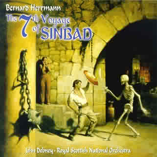 A normal size orchestra is used but with an expanded percussion section. High strings in romantic-tender-vulnerable mode are used to portray the Princess and her plight (she is miniaturised and kidnapped) and groups of brass, wind, and percussion instruments are used for evoking the monsters: the Cyclops, the dragon and the Roc; and in the celebrated Duel with the Skeleton in which Herrmann makes clever and appropriate use of the xylophone. Some of the music is ferocious as befits the fights with the huge on-screen monsters, three successive cues are especially so: "Dragon and Cyclops"; "The Crossbow"; and "The Death of the Dragon"; with really raw and guttural timbre; percussion, piano, horns, clarinets, bassoons, trombones and tubas all combining to powerful effect. For much of the score, Herrmann uses a highly repetitive pattern of simple triads and motivic figures, the material passed from instrument to instrument and subtly modulated; the ear is attracted by timbre rather than theme. Additionally, Herrmann creates striking atmospheric effects - how well he evokes Sinbad's ship becalmed or labouring through "The Fog"; and I was impressed with the cue "The Genie's Home" which employs celeste and (I think) xylophone; it is as if you are listening to running water - magically tinkling raindrops dripping at regular but opposing tempi, beautifully juxtapositioned. But I could cover pages describing so many of the 37 short cues. (This present recording is the first extended presentation of the score since the soundtrack album was compiled in 1958. Bernard Herrmann, himself, conducted the National Philharmonic Orchestra in a suite from the film score. It is now available on London phase4stereo CD443 899-2)