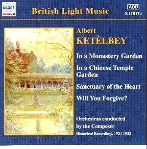 These historic recordings dating from 1924 to 1932 have great charm. The performances have that exciting bravura and portmanteau expressions complete with those sentimental slurs we associate with that period - take the romantic and sweetly sentimental In the Moonlight for instance. The great Australian bass/baritone, Peter Dawson sings Ketèlbey's most famous composition, In a Monastery Garden, and that other famous "heart-string-puller," Sanctuary of the Heart, is given the full OTT treatment by the composer's concert orchestra conducted by Ketèlbey and an unknown, unbilled contralto displaying all the full-blown mannerisms of the period. Another tear-jerker ballad is the OTT melodramatic Will You Forgive? with warbling tenor Arthur Jordan in terribly contrite mood. Albert Sandler (of Palm Court Orchestra fame) plays Ketèlbey's first big hit, The Phantom Melody with the composer at the piano. One of the most charming pieces features is The Clock and the Dresden Figures with its enchanting melody and clock-like figures. Two other pieces that are relatively unknown today are: the evocative Three Fanciful Sketches ("A Passing Storm Cloud on a Summer's Day"; "The Ploughman Homeward Plods His Weary Way"; and "Quips and Cranks and Wanton Wiles".)