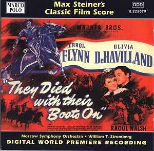Probably more than that of any other old Hollywood film composer, Max Steiner's music continues to divide opinion among film music fans and historians. No other composer from his era was as overworked or as revered. He is often credited for developing the art of scoring motion pictures into something more than source music being played in the background of a scene. His music to Gone With the Wind is arguably the best loved film score from that era and undoubtedly it epitomizes the old Hollywood sound for most people. Steiner has also taken some knocks from today's historians for his tendency to write music that mimics rather than enhances the action on screen. Whatever your opinion of his music might be, I suspect this new recording of his score to They Died With Their Boots On won't sway your opinion one way or the other. As with all their recordings for Marco Polo, conductor Bill Stromberg and arranger John Morgan have done a superb job in reconstructing this huge score and coaxing a sympathetic performance out of their Moscow Orchestra. The recorded sound could be warmer and less strident but the overall production is first class. The liner notes are superb (another characteristic of this series) and short of having had a world-class symphony orchestra to work with, this is the best production this team could have expected to achieve. The devotion to this music is obvious from all involved but I can't help thinking that a more representative Steiner score could have been chosen for this recording. The film was made in 1941 and is the story of George Armstrong Custer's (played by Errol Flynn) graduation from West Point, his romance and subsequent marriage to Libby (played by Olivia DeHaviland), his involvement in the American Civil War and finally his fated encounter with Crazy Horse at the Little Big Horn. The film is well regarded for Raoul Walch's direction and Flynn's charismatic performance as Custer. The liner notes also state that the film was one of the first to portray Native Americans in a more realistic and humane way. What is uncanny about Steiner's music is how remarkably descriptive it is. It has been many years since I last saw this film but listening to this CD prompted many recollections of the film. All the Steiner trademarks are there including the rousing fanfares and marches, a charming polka, the gorgeous melody representing Custer's romance to Libby, the fierce music depicting Crazy Horse and the Sioux Tribe as well as some frantic battle music that weaves all the major motifs along with popular tunes ranging from the Battle Hymn of the Republic to Rule Britiannia! Morgan has stated several times how difficult Steiner's scores are to reconstuct due to the very intricate writing. Steiner was undoubtably a peerless technician but even after hearing this disc, I continue to have my doubts about how well his music stands away from the images that inspired it. For me, only a few of the cues seem to stand on their own as fully developed structures that can enjoyed for their own sake. The scores of Waxman, Rozsa, Herrmann and Korngold are filled with such excerpts and that is why, I believe, their scores have survived so well and have developed a following independent of the films that inspired them. This is all very subjective and I will admit an irrational dislike for scores that quote a lot of unoriginal material or mimic the action on screen too closely - both trademarks of Steiner's western scores. Perhaps this is why I prefer his scores to the great romance pictures where his unrivalled lyrical gifts were put to such good use. Still, there is very much pleasure to be gained from this charming and energetic score and fans of film music are again indebted to Stromberg, Morgan and their impressive Marco Polo team. Reviewer Richard Adams