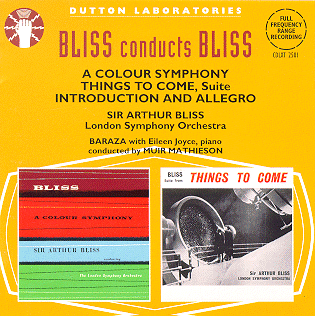 Sir Arthur Bliss produced another classic score for Alexander Korda's film of the H.G. Wells story, Things to Come. The wonderful March and the closing music, hymning the spirit of adventure and man's unquenchable thirst for knowledge, are deeply moving in the grand Elgarian tradition. A suite from the score is popular and has been recorded several times, notably by Sir Charles Groves, for EMI, coupled with Bliss' Colour Symphony. A further Marco Polo recording inludes Bliss's music for the films: Christopher Columbus (1949) Seven Waves Away (1956) and Men of two Worlds (1945) which included Baraza, a concert piece for Piano and Orchestra with Men's Voices.