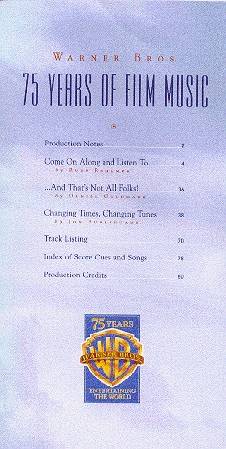LP Box Set Introduction - Warner Bros. 50th Anniversary LP Box Set The jewel of my film music collection is a silver-coloured two-box set of LPs issued in 1973 by Warner Bros Records Inc. They are/were: 3XX 2736 Fifty Years of Film Music and 3XX 2737 Fifty Years of Film. The first set comprised 3 LPs and a beautifully produced LP sized booklet with many pictures of Warner Bros musicals and dramas and it also included informative essays on the Warner Bros music department with portraits of its chief, Leo B. Forbstein, Ray Heindorf, who was in charge of all the major musicals from 42nd Street (1933) to The Music Man (1962), and Hugo Friedhofer who served as orchestrator to so many composers, principally Korngold and Steiner, before going on to write some memorable scores himself (notably The Best Years of Our Lives for Samuel Goldwyn). Portraits of the studio's major composers were also included: Korngold, Max Steiner, Franz Waxman, Dimitri Tiomkin and Alex North - together with Harry Warren and Al Dubin (for the musicals). One of the LPs in this first set was devoted to symphonic scores mostly by Korngold and Steiner but with two scores each from Franz Waxman, Alex North and Dimitri Tiomkin. The other two LPs were of songs from the musicals including one marvellous, whole LP devoted to those from the celebrated Busby Berkeley musicals of the 1930s. The final LP included songs from such artists as:Judy Garland (A Star is Born) and Doris Day (Calamity Jane), Peggy Lee (Pete Kelly's Blues) Frank Sinatra (The Young At Heart) and James Cagney (Yankee Doodle Dandy). The three LPs in the second box set, which again was accompanied by a lavishly illustrated and substantial LP-sized book, comprised some 80 excerpts (dialogue, sound effects and music) from major Warner Bros productions from Don Juan (1926) and the trailer for The Jazz Singer (1927) through to Clint Eastwood's "..do you feel lucky...well, do you, punk!?!" from Dirty Harry (1972). These sets must now be much sought after collectors items and worth their weight in gold. Review - Warner Bros 75th Anniversary 4CD Set Now, 25 years later, comes this lavishly produced 4-CD set. It is beautifully presented as a substantial Royal Blue Velvet covered thick board folder embossed on the front with a large Warner Bros. Shield in gold metallic foil. The folder is protected by a transparent plastic cover with text printed in gold on the front and white on the back (for the contents of the discs) to show up against the dark blue background. The folder has an inside pocket holding an 80 page sumptuously illustrated book. The four CDs are inlaid in a clear plastic fold-out which is the centre piece of the folder.