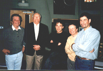 Right: Recording the soundtrack score for "The Gambler" Left to right: Karoly Makk (film director), Gerard Schurmann (composer), Marc Vlessing (film producer), Mike Ross-Trevor (recording engineer), David Wishart (music producer) |