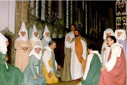 It was a wonderful discovery that long before spoken mystery plays that led to Shakespeare there had been the beautiful sung drama of the Church that led to the Mystery Plays. As Gustav Reese says "The Church was also its principal theatre indeed its opera-house." Starting with the simple question "Quem quaeritis?" (Whom seek ye?) and the answer "Jesum Christum Nazarenum" (Jesus of Nazareth) and the answer to that "Non est hic sed surrexit" (He is not here but risen) this little dialogue was gradually expanded into a whole drama. The drama was naturally sung because priests always do or did, sing, in order that their voices might carry in large buildings. Three priests in their flowing vestment can easily represent the three Maries and it is not long, before each Mary will require a verse, or indeed three verses of her own before they eventually arrive at the steps where the Angel meets them. "Whom seek ye?" Soon the Maries are not satisfied with the little dialogue with which the drama had started. In particular Mary Magdalene will not be satisfied until she sees the Master with her own eyes even if she cannot touch him. Then at last she will be content to turn to the congregation and invite them all to participate. The rest of the drama was celebration. When we performed at Kingston Parish Church one saw how these church dramas could have turned into the mystery plays. The market-place was just outside the church. Perhaps the songs that frequent the Shakespeare plays are a survival from the days when drama was musical. I was fortunate in managing to get from France a copy of the famous Fleury MS which contains one of the best sets of these dramas with music. I was anxious that they should be understood, so I translated the Latin into the beautiful language of the Authorised Version. Fortunately I was able to read the somewhat faded notation and the Latin words on this thirteenth century manuscript. I took a lot of time fitting in the authorised version to the original rhythms in the music. In the MS it was, of course, a single line for the melody with no accompaniment, but I did not think modern singers at any rate could go on perhaps half an hour without any form of accompaniment, so I added a background of sound as tactfully as I could which helped to keep the singer in tune and sometimes used the melody in the accompaniment, especially where it was advisable to remind the singer of his vocal line. What was most interesting was that there were clear indications of recitative followed by arietta so that the later developments of opera were already being indicated. For the first and second acts of our modern performance of these ancient dramas we used The Visit to the Sepulchre and the "Peregrinus" which we called "The Wayfarer". To these we added a drama on the "Ascension" which came from Moosburg. The "Peregrinus" tells the story of the Journey to Emmaus. Cleopas and St. John greet the Stranger who joins them on their walk. He seems to know nothing of recent events in Jerusalem, but discourses on what should be known about historical event. When they draw near to their destination they invite him to join them. "Abide with us, for it is toward evening and the day is far spent." He goes in with them and is recognised in the breaking of bread when He disappears. They rush back to tell the others how they have seen the Lord. The incident of the Doubting Thomas is added to this scene in a very effective way. Thomas declares his doubts then suddenly the risen Christ appears. The whole scene is most moving, especially when acted well, and the work ends very effectively with the whole Chorus singing the passage from the Romans: "Christ being raised from the dead dieth no more." The scholars like to call this the liturgical drama, but there is nothing liturgical about it, except perhaps in its origin. It is plainly an early outflow of opera. The priests were trained singers and they saw that they could give the laity the most vivid idea of these stories by enacting them as sung dramas. They had so inspired the laity that they had encouraged them to make a drama of their own. Unfortunately the priests soon forgot that they had been the original inspiration and gave up the attempt to lead the laity in drama. The spoken play took the place of the sung drama and the subject matter ceased to be sacred. A few centuries later people knew nothing of the sung drama of the Church and thought they had invented opera as a secular form of drama. The practice soon spread to other seasons of the Church year, especially Christmas. The Christmas story was also well suited for treatment in this way. The first play was obviously the Shepherds and their visit to the crib located in the sanctuary where they present their rustic gifts. The Second Play, which is generally called The Star is largely concerned with the Magi who meet, perhaps, at the back of the church and proceed down the aisle led by a boy carrying a long pole with a light at the end of it. They proceed towards Herods court, which is located in a side-chapel. A discourse takes place between Herod and the Magi carried by a character called the Knight, who appears to be the general factotum at Herods court. Hearing of the Star Herod sets his Wise Men turning up the prophecy of Bethlehem and the Magi are bidden to seek their star in Bethlehem, not forgetting to come back and report to Herod if they find anything. So the Magi proceed on their way to the Crib where they present their gifts of gold, frankincense and myrrh. They are warned by an angel in a dream to go back another way so as to avoid meeting again with Herod. But Archelaus, Herods son notices that they have not come and stirs up his father. "You are betrayed, my lord". This is the beginning of the third play, which goes under the name of "Rachel". The opening of this play is marked by the appearance of the Innocents who parade singing their first chorus. They attract the attention of the Kn