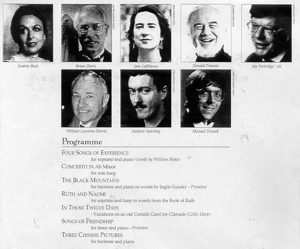 Many artist friends contributed to the success of this Concert, and many friends and relatives came to hear the music as well as many whom I did not know. The Deputy Grand Bard, Ann Trevenan Jenkin, came from Cornwall. Mrs. Vaughan Williams represented her husband, with whom I had studied so happily. Mrs. Antony Benskin came up from Devon, her husband being unable to join her for health reasons. From Cornwall also came Mr. Donald Rawe, a particular representative of Cornish culture. From Ireland a whole contingent including, of course, my younger daughter, Penny with her husband Philip and his parents Eric and Eve Beck, together with their friends, the architect and musician, Mr. and Mrs. Brendan Chawke. Our older daughter Suzie was also there with her husband, Peter, his father, Desmond, Aunt Jennifer and brother Christopher. I had arranged for my singer friend, Donald Francke, to introduce proceedings, which he did in a very lively fashion which set everybody in a good mood. The first artist to appear was Jane Lofthouse who came on to sing my Blake Songs, accompanied by Michael Dussek, Hear the Voice of the Bard, The Sunflower, The Sick Rose and The Tiger. They had been broadcast some forty years ago by Wilfred Brown accompanied by Frederick Stone. Jane had sung the first of these several times before, including a very successful performance I remember at St. Michaels Mount when I was first introduced to her brilliant accompanist, Michael Dussek. Next came Brian Davis to play my Concerto in A flat minor for solo harp. I have explained in the programme notes that this was a work like Bachs Italian Concerto written for an instrument like the harpsichord that could do all sorts of different things like sweeping chords (in the case of the harp), harmonics, filigree patterns, repeating the same note on different strings, glissando and can therefore play a concerto with itself, without the need of an orchestra. The first half ended with a song cycle sung by Donald Francke accompanied on the piano by William Lewarne Harris called The Black Mountains.