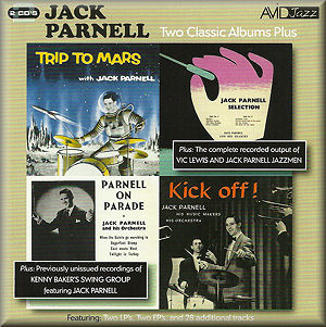 This new compilation includes not only the LP Trip to Mars and the EP Parnell on Parade but also numerous other tracks including all the recordings Jack made with the band that he co-led with Vic Lewis in the mid-forties. Vic Lewis later became an aficionado of Stan Kenton's modernist music but the group with Parnell was unashamedly a swing band, containing seven or eight musicians. Lewis should have resisted adding his rather corny vocals to several tracks, but the band was lifted by the contributions of such excellent players as soprano saxist Ronnie Chamberlain, pianist Dick Katz and of course Jack Parnell on drums.
