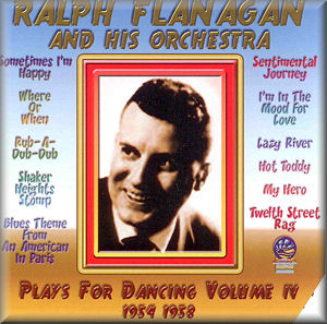 This CD, the fourth volume of radio broadcasts in this series by the Ralph Flanagan big band, covers the years 1954-1958. That decade was one which, unknowingly for many of us at the time, witnessed the twilight of the big bands. In the late forties there had begun a shift to small groups. Louis Armstrong, for example, abandoned the big band format in the late forties and went to the All Stars, a seven-piece group. At the same time, the traditional jazz revival, to which many teenagers were flocking, was under way, the bands playing such jazz being comprised of six or seven musicians. Also by the mid-fifties rock and roll was making its entrance.