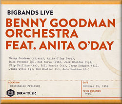 This disc is one in a series entitled Big Bands Live from new kid on the jazz records block JazzHaus which is making available its huge reservoir of 3000 hours of recordings by over 400 ensembles and soloists which come from the archives of South-West German Radio in Stuttgart, Baden-Baden and Mainz, the earliest dating from 1949. This 1959 concert recorded live at the Stadthalle in Freiburg is one such and is a thrilling rollercoaster white knuckle ride of swinging big band jazz from one of the undisputed kings of swing Benny Goodman. Bringing together some of the greatest names in that world Goodman has here a true dream team of a band that at ten soloists is tight, highly controlled and extremely musical and when you add into this heady mix the superb Anita O'Day this is a disc to savour. Setting the scene the first three tunes are well known staples and then in comes Anita with her beautifully judged Honeysuckle Rose and as always she sings it with a laugh in her voice and a cheeky style, followed by Come Rain Or Come Shine and we hear her scatting as only she could. I wonder what she was wearing for the occasion because in my imaginings she's always wearing that impossibly tight dress that she wore in the best ever jazz film Jazz on a Summer's Day along with the hat with the extra wide brim. Her vocal style was simply unique and her voice a true jazz instrument in a way that few others could ever emulate. She follows this with Let Me Off Uptown in which she has a dialogue with trumpeter Jack Sheldon. It's interesting, though unsurprising how she could lift a tune as she does in Gotta Be This and whether her contribution was large or small she made it hers. Body And Soul opens with a solo from Benny whose wonderfully warm fat tone on clarinet was so very distinctive and this version with contributions from vibes wizard Red Norvo and pianist Russ Freeman make for 3 minutes of jazz heaven. The real highlight for me on the disc is the 3 song medley which gives us back the great Anita for some fabulous singing once again. Ten Bone is great fun in which Flip Phillips and Bill Harris give great solos on tenor sax and trombone. The disc ends with "6 of the best" finishing off with a beautiful rendition of Bei Mir Bis Du Scheen featuring great solos from Benny and the brilliant Jack Markham giving an object lesson on drumming perfection. As the liner note says with complete justification "...these sets spark and crackle with energy even 50 years on."
