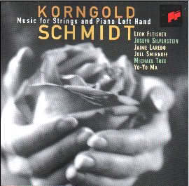 Franz Schmidt (1874-1939) was, like Korngold, an Austrian. His Quintet in G for 2 violins, viola, cello and piano left hand is, like the Korngold work, accessible and melodic. The piano part is less showy and more integrated into the fabric of the whole. To quote from David Grayson's erudite CD booklet notes (which include fascinating background detail about the Wittgenstein family) - "...the piano part, often delicate and suggestive of a harp or celesta, blends readily with the rich Brucknerian string writing." The outer movements are light and genial; the melodies as openly romantic as any by Korngold. The central movements are more introspective; the Adagio is particularly affecting, poignant and anguished by turn while in the Sehr ruhig third movement, the instrumentalists engage in an elegant and refined dance. As might be expected from such a distinguished line-up of soloists, these are exquisitely blended performances of real distinction.